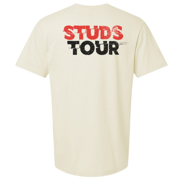Unisex off white tee with photo on the front and Studs Tour on the back.